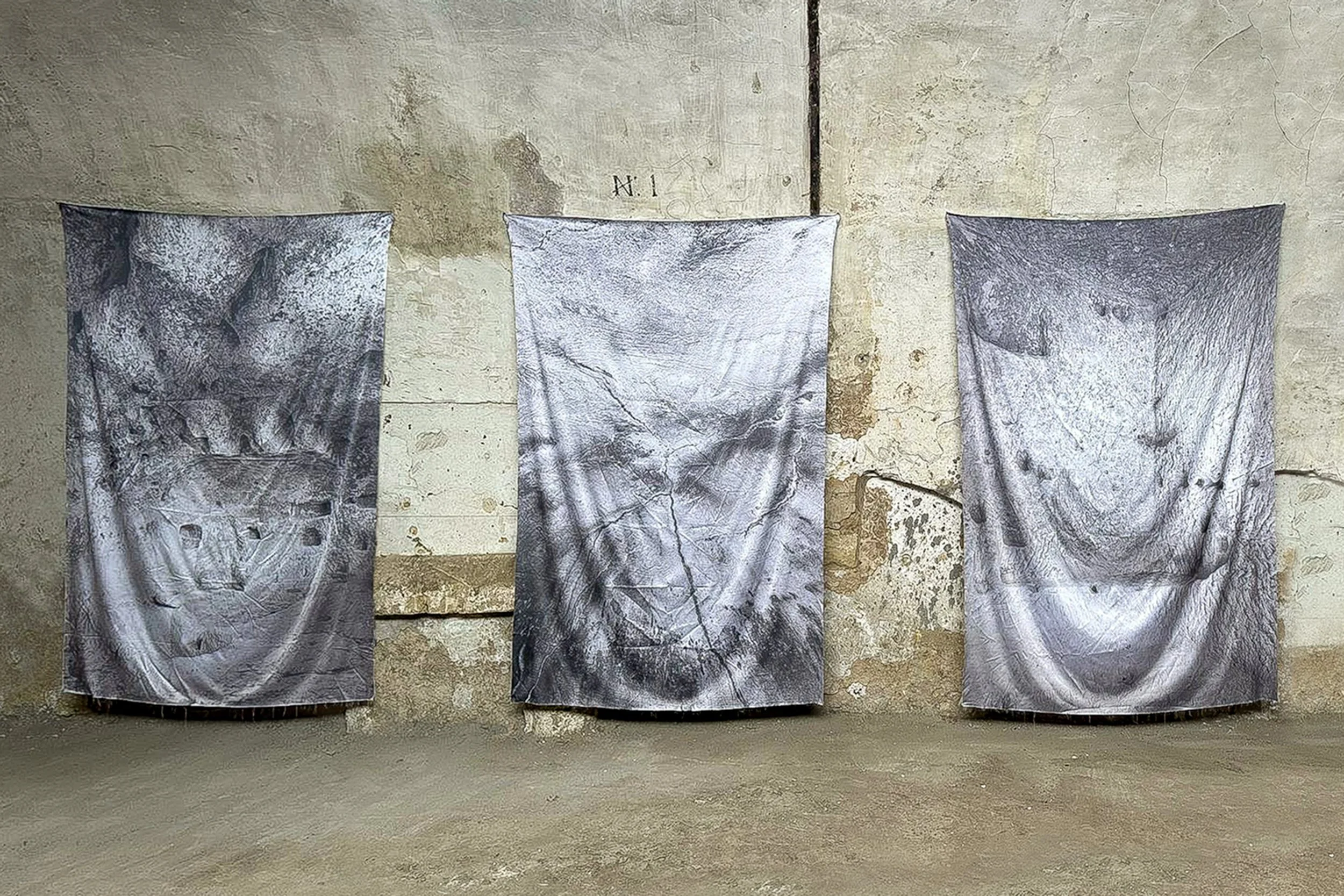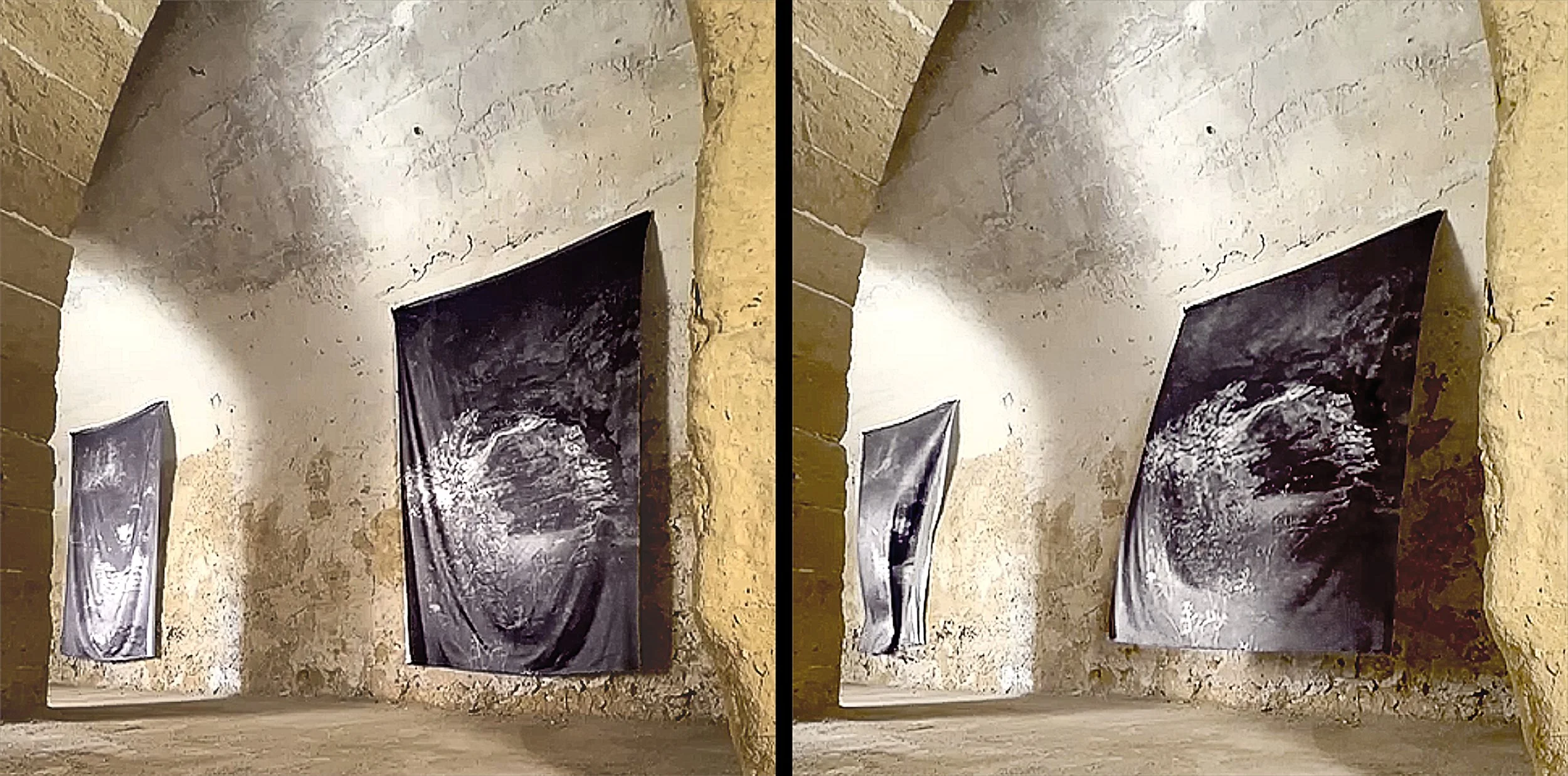 En réalisant des impressions photographiques sur de vastes étoffes, Amélie Labourdette cherche à rendre tangible les présences sensibles des énergies telluriques, forces sous-jacentes qui animent ces grottes et abris souterrains. Elle aspire à retranscrire la spectralité et la labilité des forces sous-jacentes qui animent ces lieux énigmatiques. Telles des spectrographies, les impressions matérialisent la mémoire matérielle et immatérielle, physique et invisible de ces mondes ancestraux. Les tissus suspendus d’une lueur satinée, palpitent au gré des courants d’air. L’espace de l’exposition pensé comme un corps de membranes flottantes explore alors l’intimité de cette idée ancienne d’une énergie créatrice des femmes en osmose avec les forces telluriques.