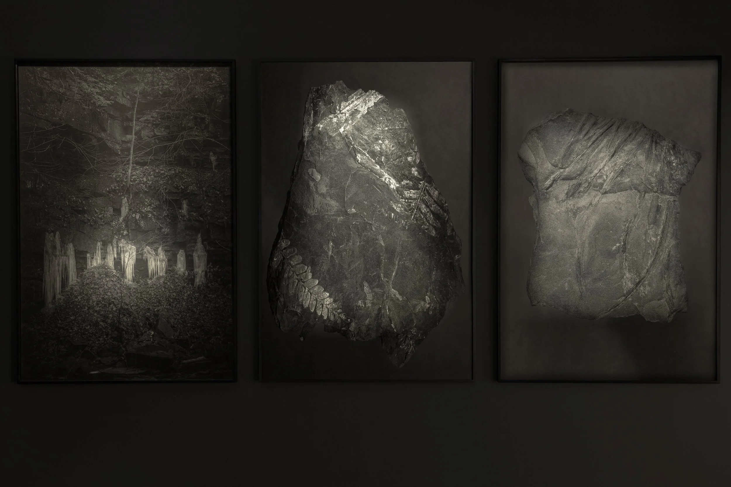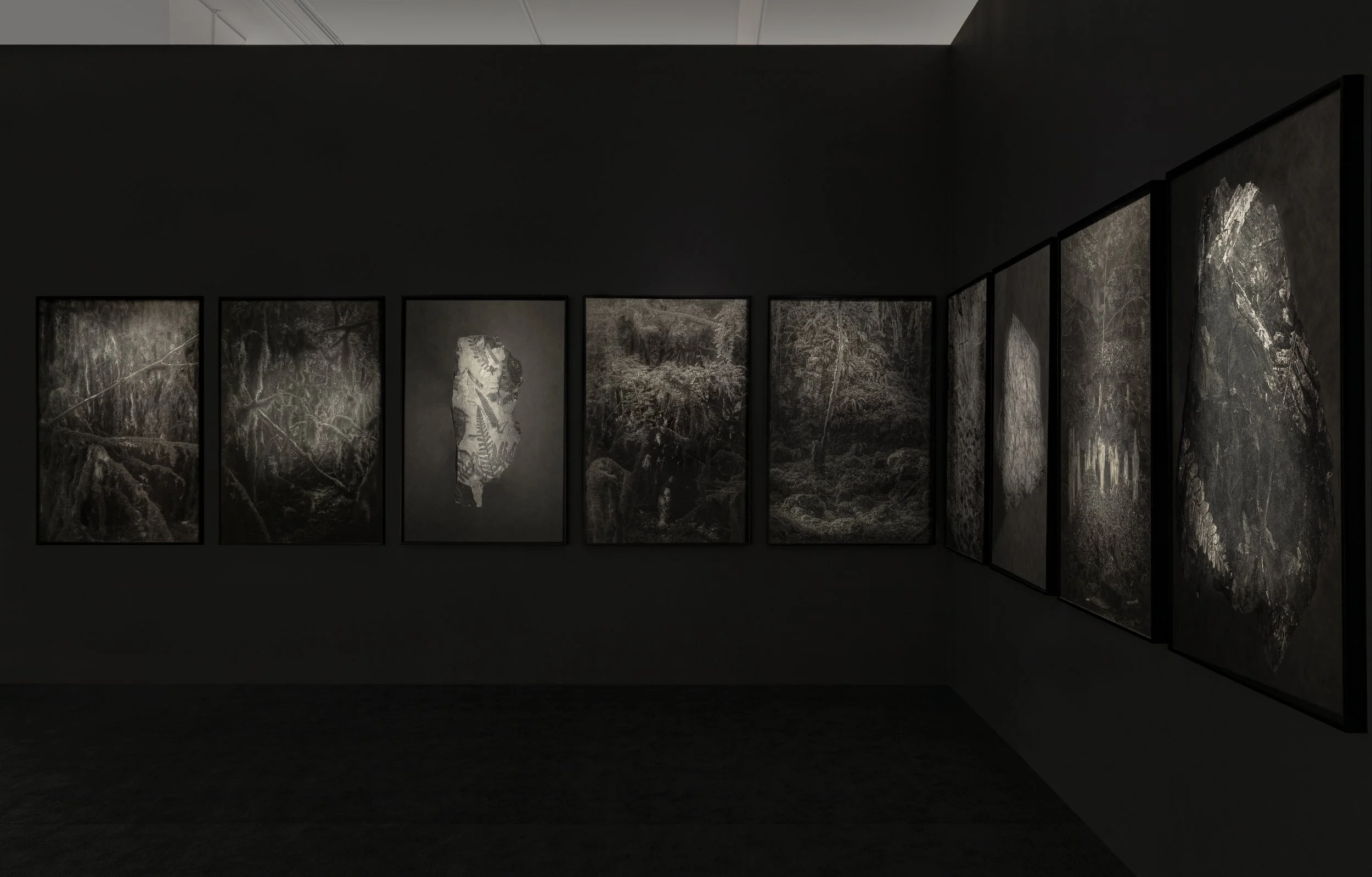 Ten large-format Piezography (charcoal ink) prints from the series A Pure Spirit Grows Beneath the Bark of Stones are installed in the exhibition’s camera obscura space.